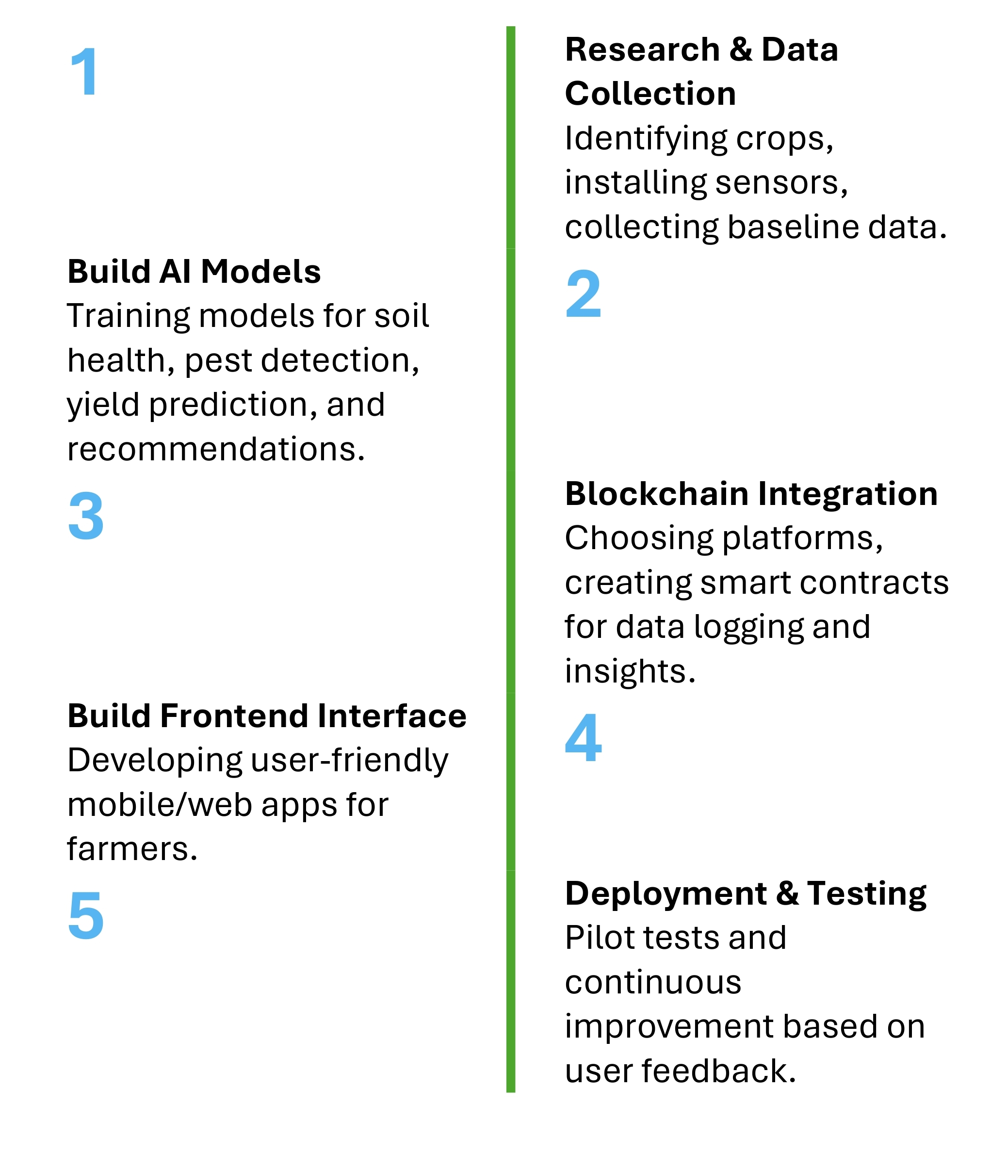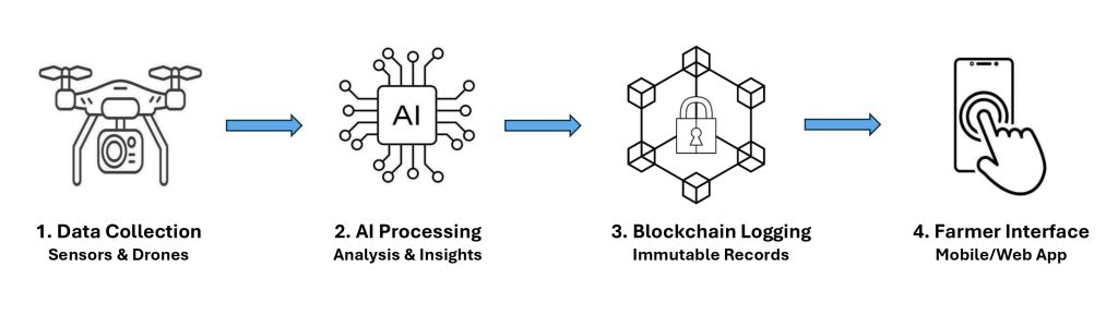Data flows from sensors/drones to AI processing, is then logged on the blockchain, and finally displayed on the farmer interface.